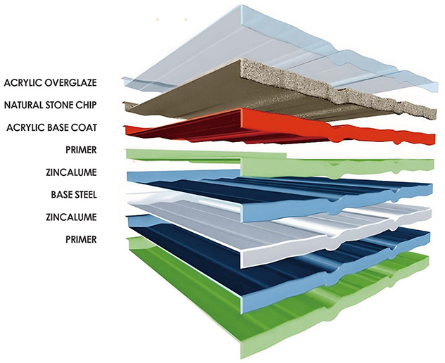 Galvalume AZ150 alloy (Aluminum Zinc plated steel sheet =PPGL), Natural stone chip, Acrylic resin glue |