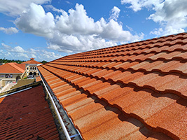 Our Verona roof tiles are made with a 26 gauge high corrosion resistant aluminum-zinc- steel sheet (aluzinc) as the substrate which is coated with a highly weather-resistant acrylic resin as the adhesive. The surface layer is finished with natural volcanic stone chips sourced from the finest quarries in France. This roof offers a compelling combination of durability, energy efficiency, fire resistance, low maintenance, and aesthetic appeal for any residential or commercial building. These advantages make them a practical and sustainable choice, ensuring long-term protection and enhanced value.